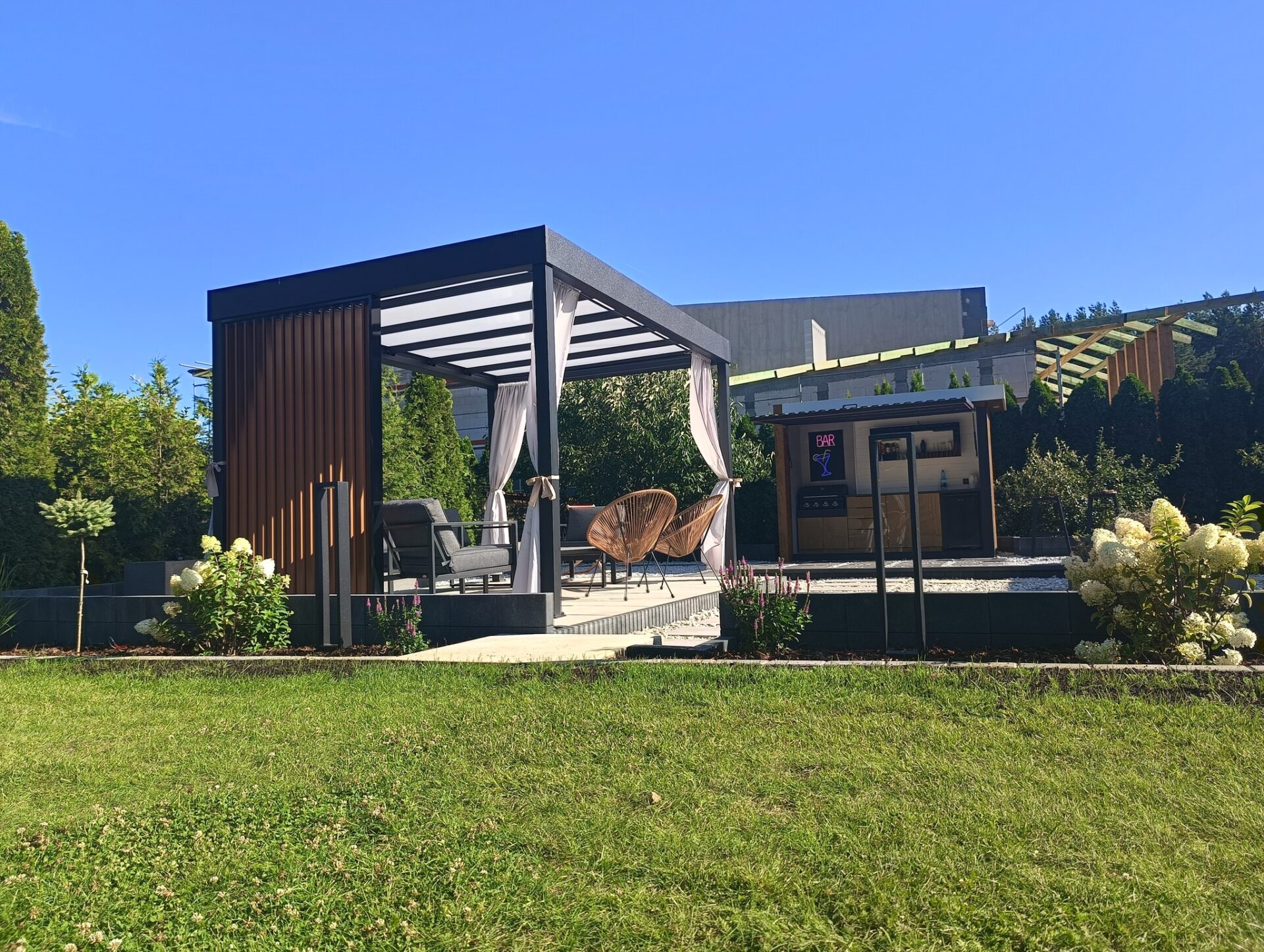 - Pergole tarasowe – wolnostojące konstrukcje z ukrytą rynną, łączące nowoczesny design z wyjątkową trwałością.